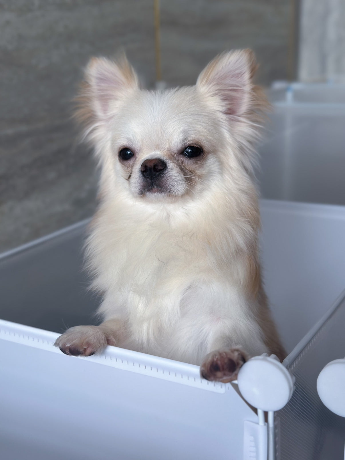 This male Chihuahua was born on 3 February 2025. He is long-haired, silky, with a clean black nose and dark eyes that give nothing away. If you didn’t know what happened in the crate he arrived in, you would never guess he was the one causing all the trouble inside it.